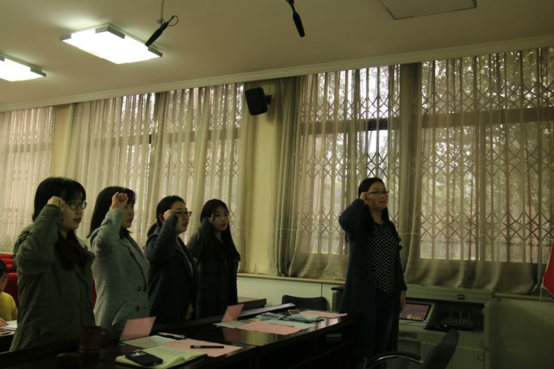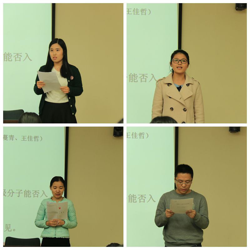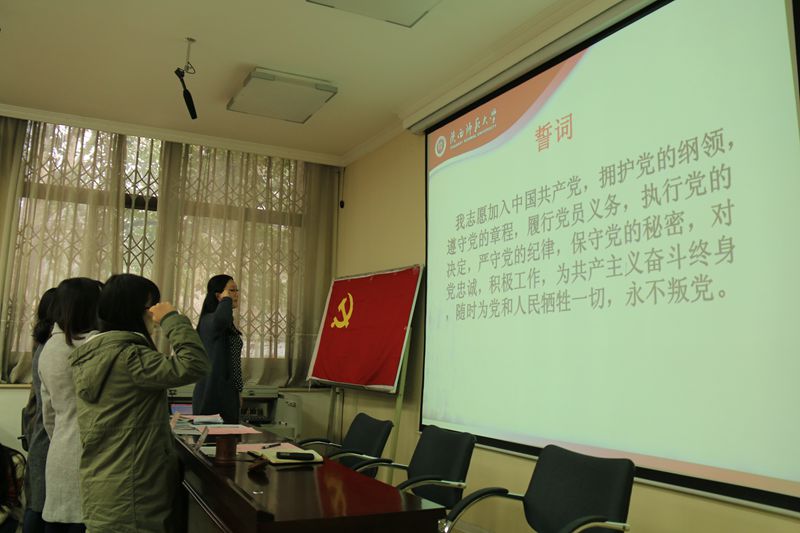 大会讨论了关于接收闫学诗等八名入党积极分子成为预备党员、郑潇等四名预备党员转为正式党员的有关事宜。大会严格按照党员发展流程进行了个人陈述、意见宣读、投票表决等环节,最后,四位预备党员在党旗下庄严宣誓,正式成为中共党员,完成了人生中的重大转变。