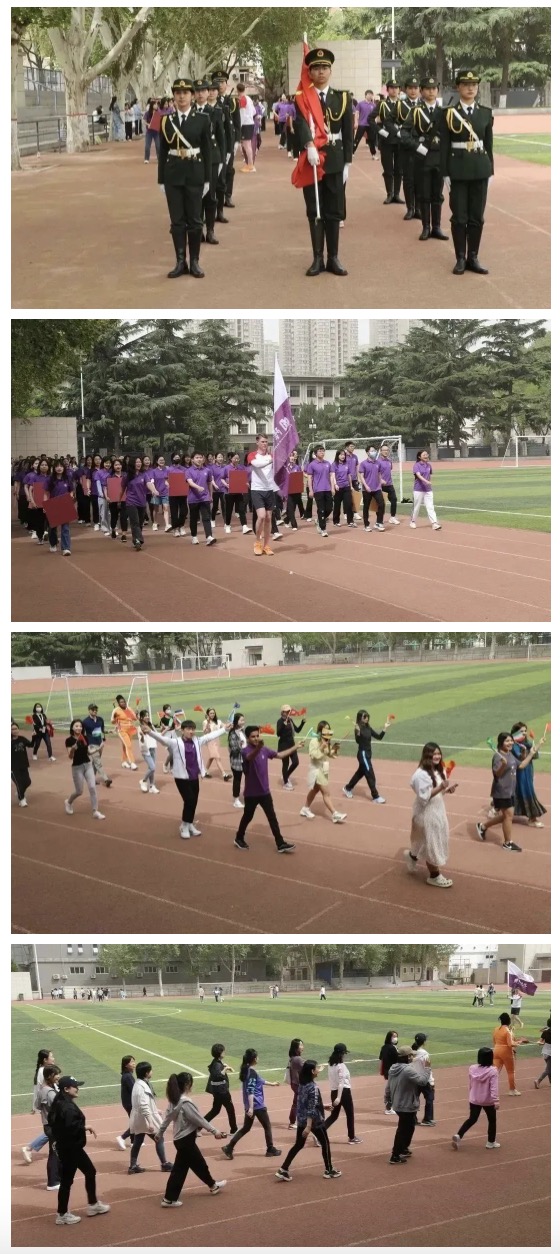 党总支书记马兰、院长石洛祥、副书记张昊、副院长贾泽林、孙建伟、李敏,工会主席曾柱、各教研室负责人、教师代表、行政老师、学生辅导员以及全体中外学生参加运动会。开幕式由副书记张昊主持。