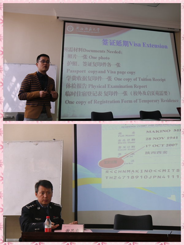 西安市公安局出入境管理处外管科警官谢思农从签证基本知识、法律法规须知、日常生活注意事项等方面为新生们做了详细的法律法规政策讲解。留学生管理办公室黄璐老师从签证办理、课堂考勤及日常学习等方面给新生们做了系统的入学教育,为他们在陕西师范大学的学习和生活做了全面的指导。
