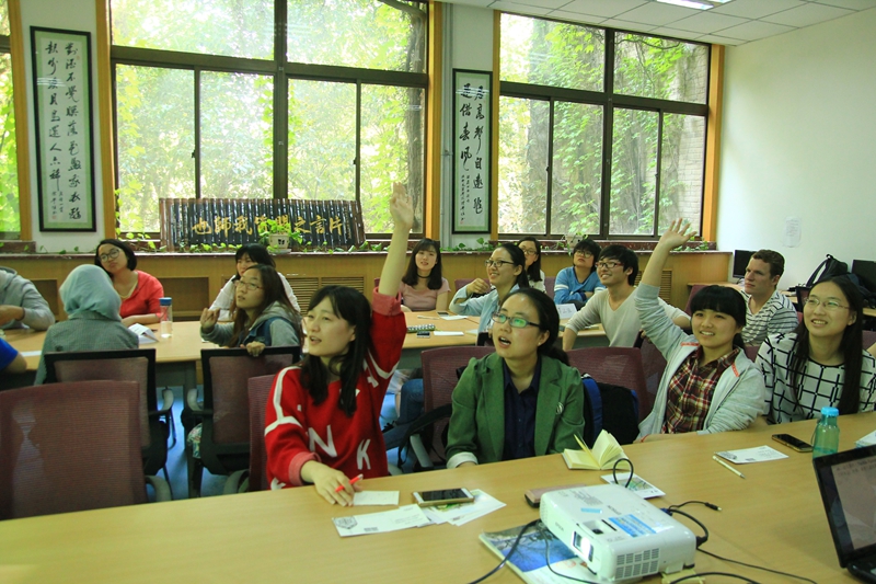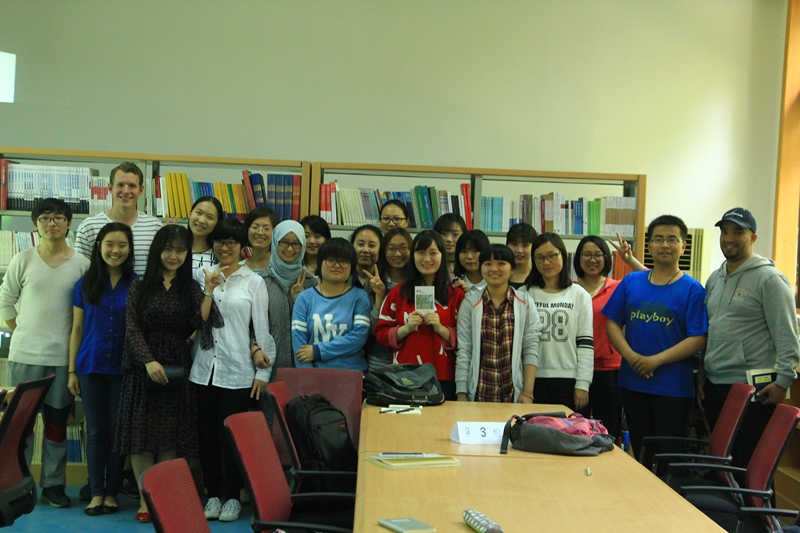 阅览室举行。来自摩洛哥的留学生尤纳斯和来自美国富布莱特项目的留学生康宁森、李博雅一起,与汉语国际教育专业的19名中国学生就阅读的相关话题进行了深入的交流。