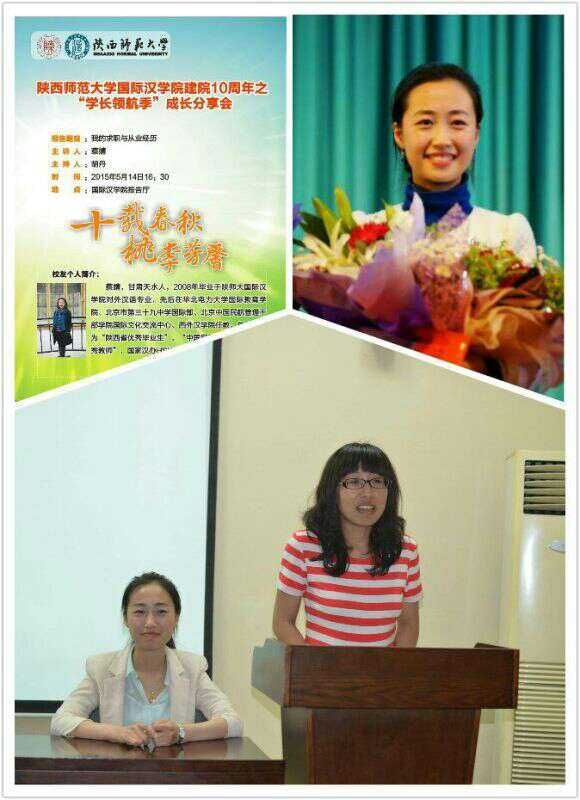 国际文化交流中心,她向我们介绍了那里的工作经历。首先,工作量大,一周至少26节课。其次,压力大。从仪表到讲课都有严格要求;教学主管对老师的评价只有批评鲜有表扬;每一学期有两次学生测评,低于4.5分就会直接被辞退;教学研讨会上讲得不好,就要进入半个月的试用期;更别提备课会对教案和PPT的严格审核。蔡同学从初入职场的新人,一步一步地成为了一名优秀的对外汉语教师。“做难事必有所得,”蔡同学如是说。回到西安后,她又参加了考研,重新回到师大母亲的怀抱,说到这里,蔡同学红了眼睛,真诚地感谢了昔日同窗王羽红同学对她的帮助。最后,蔡学姐总结道,“一定要做好准备,抓住机遇,这样才能找到自己想要的人生。”