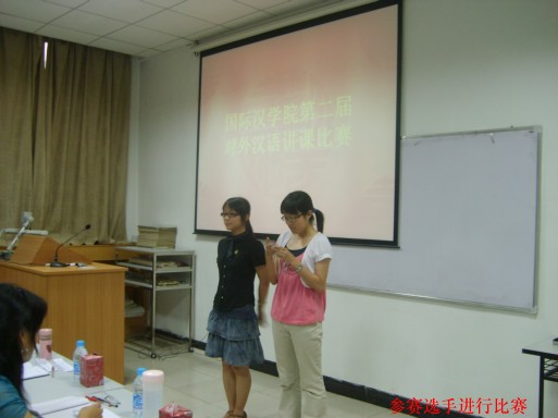 比赛中,16位选手各显其能,展示了自己扎实的基础知识和不俗的讲课本领,同学们语言得体,教态自然,课堂内容丰富,教学手段多样,课程类型涉及到精读、泛读、口语、写作、文化等,并将板书、多媒体课件、电子杂志、Flash动画等丰富多彩的教学手段很好的结合,应用于讲课中。课题内容也丰富多彩、贴近实际,有关于中国文化的《旗袍》《孝文化》《筷子文化》《拜年》,有讲解语法的《偶尔、偶然》《正反问句》,有练习口语的《你喜欢什么运动?》有讲写作的《留言条》,有综合性的《叫你起床》《堵车》《有些感觉正在离我们远去》《网络》《外来词》。比赛异彩纷呈,各位选手都表现出了不俗的实力。