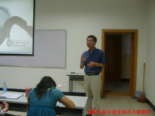 赛前,赵学清教授做了讲话,他强调了实践技能对于对外汉语专业学生的重要性,鼓励同学们多多参与到此类比赛中,并预祝比赛圆满成功。