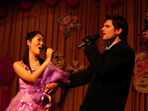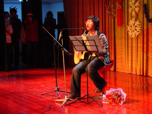 中西结合特点演绎的淋漓尽致;来自校团委的李亚云老师演唱了《大西北的鼓声》,充分表现了大西北人民的那种旷达、豪放的气概;在来自05级对外汉语班的欧阳莉和来自加拿大的郭峰的《今天你要嫁给我》之后,晚会进入了现场互动环节,观众们积极参与,认真回答问题,滑稽可爱的圣诞老人将礼物送给一个又一个幸运儿;互动环节结束后,来自越南班的现代舞《舞娘》将现场气氛带向了高潮;而晨星班的小品《圣诞节的来历》更是引得观众们哈哈大笑;来自韩国的留学生郑荣光演唱的《美丽的爱情》引得现场女同学发出阵阵的尖叫声;来自05级对外汉语班的拉丁舞,将现场的观众引向了神秘而又迷人的拉丁世界;在来自韩国的朴辅仁和来自澳大利亚的逯敏轩表演钢琴四手联弹《Flying Petals》时,原本热闹的会场迅速寂静了下来,观众们被美丽动听的音乐深深地打动;之后,雷电竞