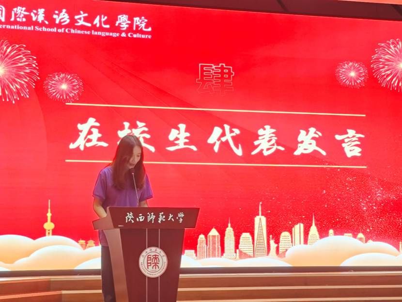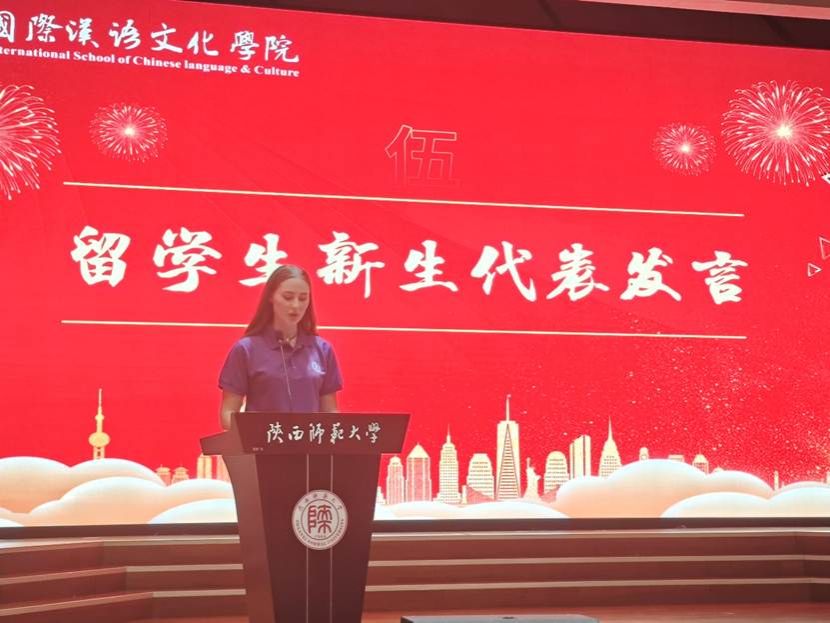 来自俄罗斯的国际研究生新生代表丽玛上台发言,经过自己在陕西师范大学四年本科的学习,已经从“老外”变为“老内”,她鼓励初到中国怀揣梦想的留学生新生们:第一,不要害怕犯错,勇于开口。第二,多参加校园文化活动,这是学习汉语最好的方式。第三,主动结交中国朋友,他们会是你最好的老师。第四,保持好奇心,每天学习新知识。同时她作为研究生新生还表达了对未来学习生活的美好期待,并表示将珍惜宝贵的求学机会,努力学习专业知识,积极促进中外文化交流,争做文化交流的使者。
