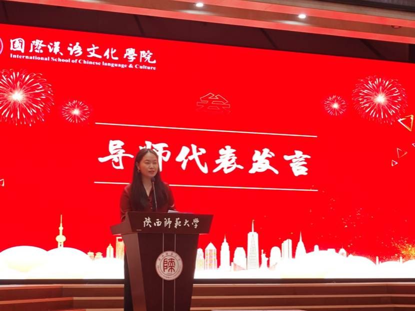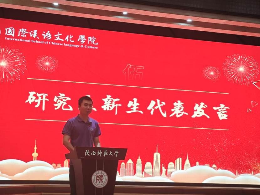 在校生代表吴姝瑶作为2023级汉语国际教育专业硕士研究生代表全体同学欢迎2025级新生,分享了在校学习生活的体会与收获,并学姐的身份,为新生们提供了实用的建议:尽快制定学业与职业规划,主动与导师沟通,找准方向。对学术科研保持“钻劲”与“韧劲”,对生活保持“热爱”与“活力”。鼓励他们积极投身校园活动,全面成长。