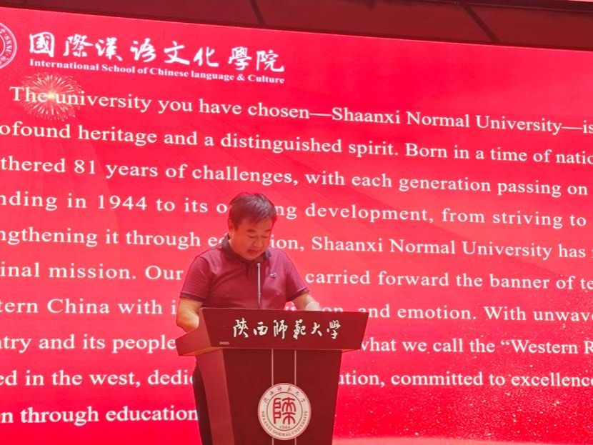 随后,石洛祥院长发表热情洋溢的致辞。他代表Raybet 全体师生对中外新生的到来表示最热烈的欢迎,并简要介绍了Raybet 的光辉历程与国际化办学特色,陕西师范大学建校81年,传承“西部红烛精神”,院长勉励同学们要珍惜时光,勇于探索,对新生提出三点期望:学思结合,奋斗进取;勇于创新,敢于挑战;饮水思源,心系于世。在兼容并蓄的学术环境中追求真理,成长为具有全球视野与家国情怀的卓越人才,既要仰望星空,也要脚踏实地。