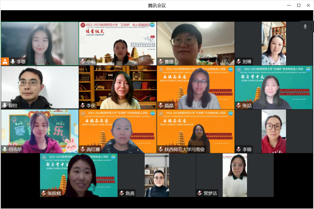 至此,陕西师范大学2022年“汉语桥”线上团组交流项目圆满结束。2023年是全面落实党的二十大精神开局之年,是全面建设社会主义现代化国家新征程起步之年,也是“一带一路”倡议提出10周年和改革开放45周年,同时,疫情防控政策也迎来了重大调整。在此背景下,中外交流与语言合作中心2023年“汉语桥”团组项目将在原有基础上,进一步服务国家外交大局、促进中外青年交往,雷电竞(Raybet)中国官方网站