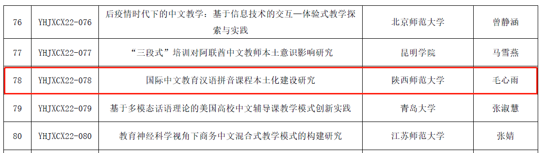 研究生毛心雨申报的《国际中文教育汉语拼音课程本土化建设研究》项目成功立项,获批资助经费2万元。该级别项目为雷电竞(Raybet)中国官方网站