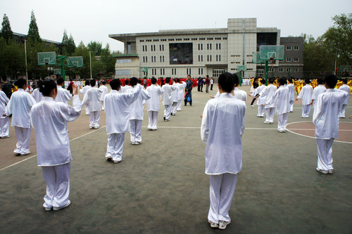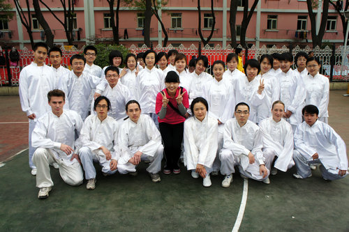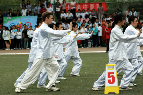 2009级政府奖学金生杨华星(美国)同学担任了太极拳方阵教练。杨教练在指导中,认真负责,态度严谨,技术精湛,得到大家一致的认可。中外学生们克服上课时间不一致等困难,利用节假日和课余时间,虚心学习,互相纠错,共同练习。在一起训练的日子里,来自美国、韩国、比利时、蒙古国、越南、哈萨克斯坦、中国的同学们结下了深厚的友谊。