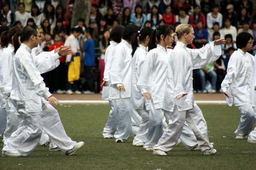 七名留学生与2008级对外汉语专业部分学生组成的太极拳方阵表演,力拔头筹,取得全校第一名的好成绩。
