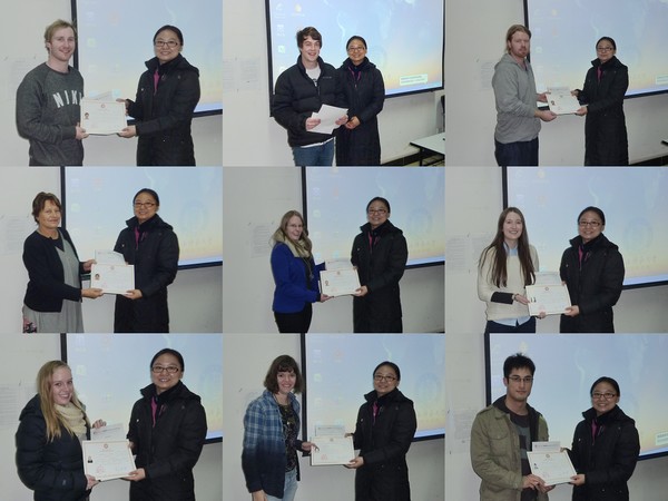 1月17日,澳大利亚塔斯马尼亚大学与新英格兰大学2013年汉语言短期进修班20名学员在我校经过两个月的学习以优异的成绩圆满完成学业,雷电竞 副院长吴媛为学员颁发了结业证书和学习成绩单,并对他们给予了新的期望与祝福。