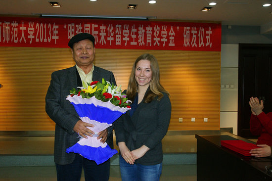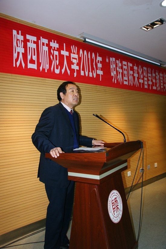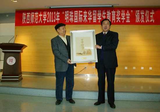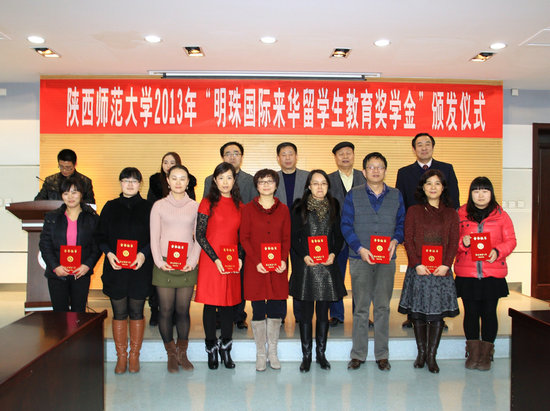 12月26日,陕西省第一个留学生企业奖学金——“明珠国际来华留学生教育奖学金”颁奖仪式在我校崇鋈楼闻道堂隆重举行。自2013年起,民营企业明珠国际集团决定每年拿出10万人民币用来资助陕西师范大学的来华留学生教育,这不仅是我校首个留学生企业奖学金,同时也是我省首个由企业资助设立的面向来华留学生教育的奖学金。该奖学金将优先考虑来自中亚地区留学生的培养,进一步加强我省和中亚及周边各国的交流合作,以更好地服务于我省“丝绸之路经济带”建设。明珠国际集团董事长李继和,总裁秘书黄兰,我校党委副书记、副校长王涛,国际交流与合作处处长徐峰,教育基金会秘书长、学校办公室副主任刘建斌,雷电竞