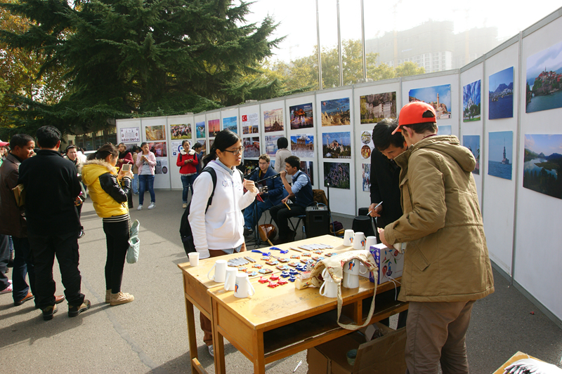 本次活动采取在行人道两旁分设展示台的方式,围绕土耳其文化与美食进行了内容丰富、形式多样的展示。道路南侧近5米的图片展示区内,巨幅的蓝色背景墙上贴满了洋溢着蓝色土耳其风情的建筑、风光、民俗等介绍图片。道路北侧的土耳其风味美食区展示的由土耳其学生们自己动手制作的各式原汁原味的土耳其糕点、小吃吸引了不少过往同学及老师们的注意。特别设立的“免费红茶小站”上,一杯杯免费赠饮的香浓的土耳其红茶为前来观展的师生瞬间驱走了冬日的清冷。