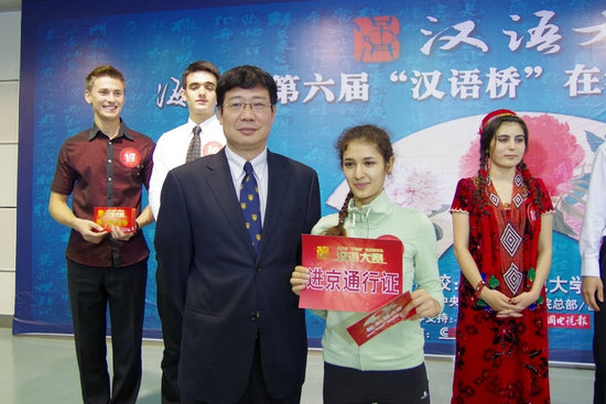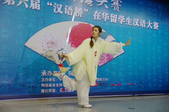 我校来自乌兹别克斯坦的谭美以一身飘逸的中国功夫服亮相,表演了拿手的太极拳、长拳和剑术的中华功夫组合秀。她干净利落的动作、英姿飒爽的身手博得评委和观众的一致好评。在评委提问环节上她也表现出色,最终成为本场唯一一个直接晋级决赛的选手,将于8月份代表我校前往北京参赛。我校游旭群副校长向谭美现场颁发了“进京通行证”,并向她表示祝贺,希望她再接再厉,争取更好的成绩。