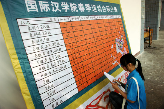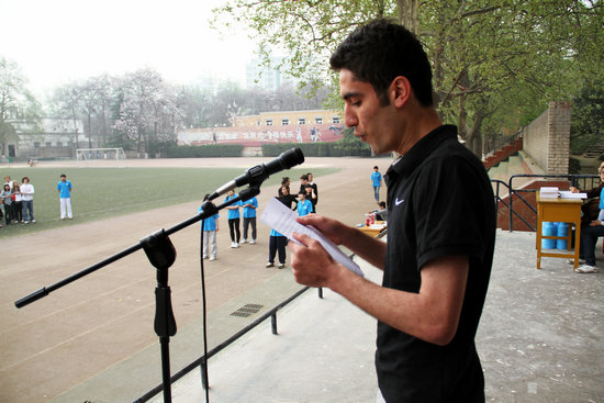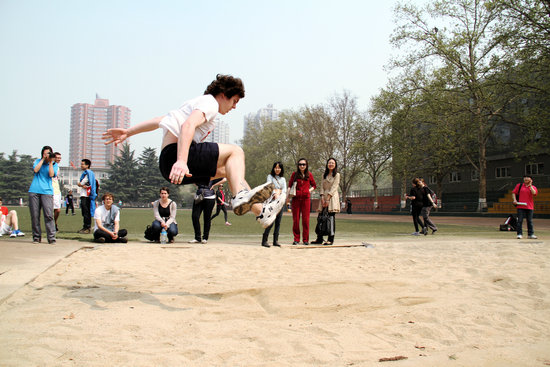 比赛在男子100米预赛中打响第一枪,中外学生互相比拼,加油呐喊。同时田赛组的跳远项目也精彩纷呈。美国学生史孟康甚至跳出了4.96米的好成绩,赢得在场观众的惊叹和赞许。