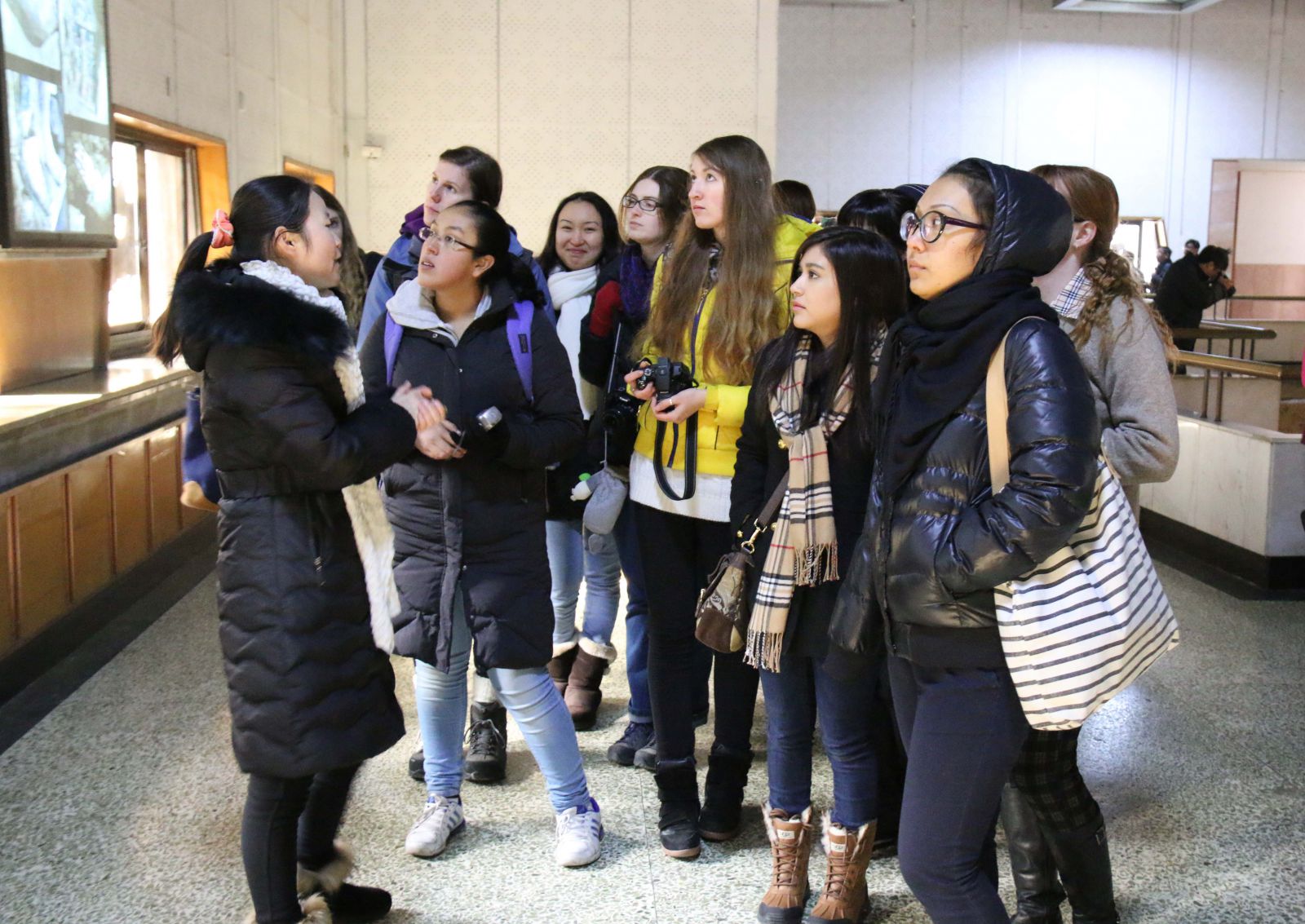 上午十时,一行人抵达秦始皇帝陵博物院。带队老师参照学生需求,根据中、英文讲解将40余名学生分为两组,带领留学生观看了还原秦始皇帝陵修建过程的影片,并参观了震撼壮观的一、二、三号俑坑。