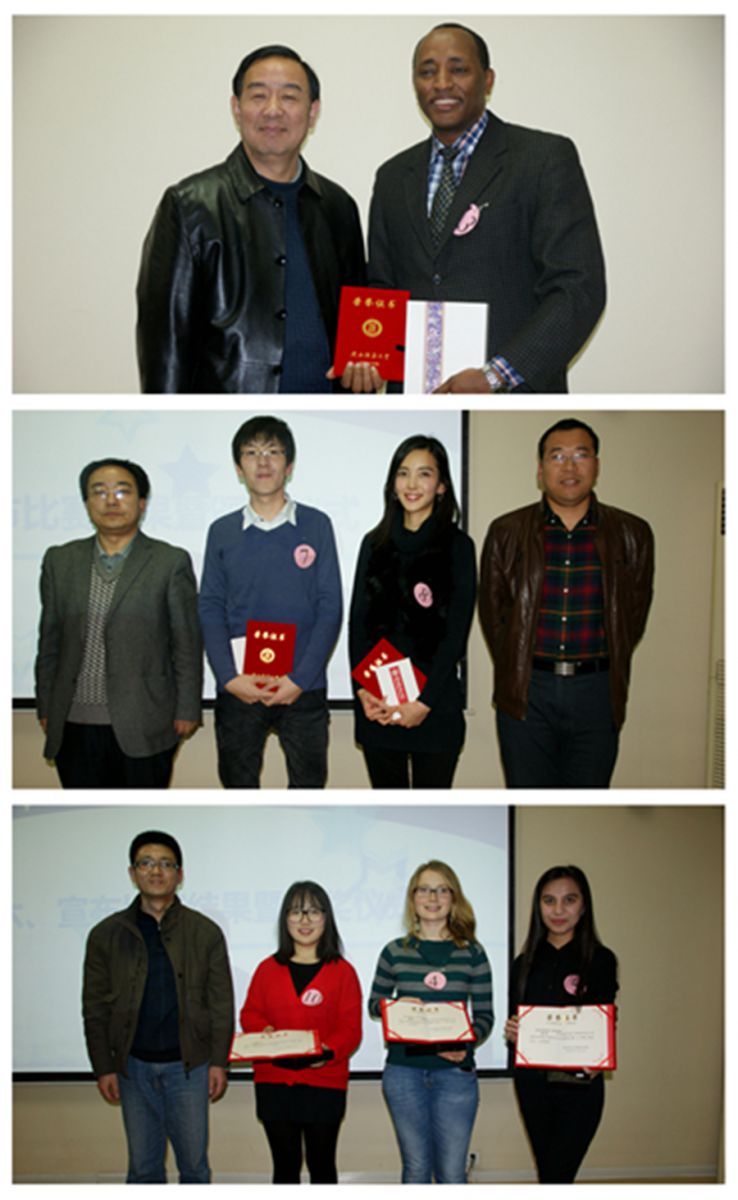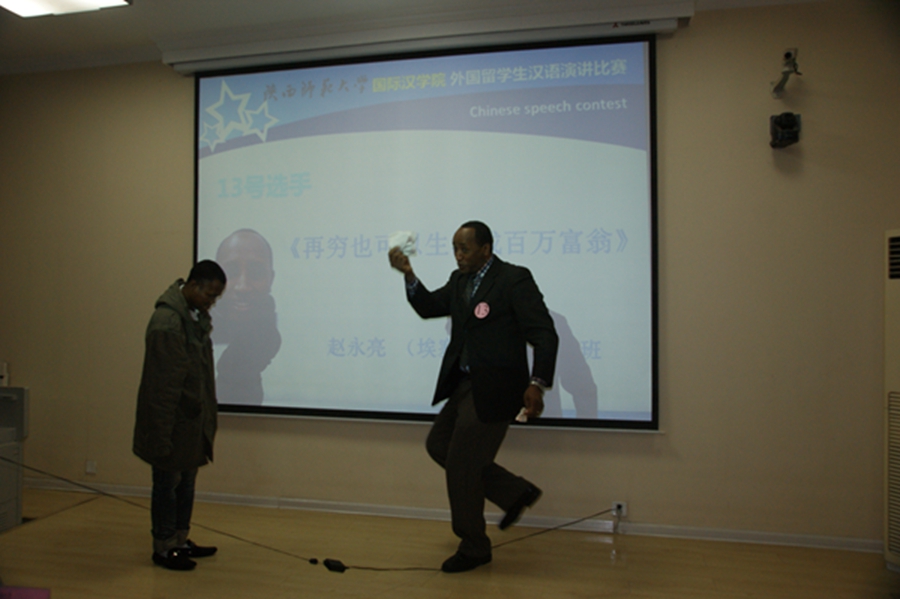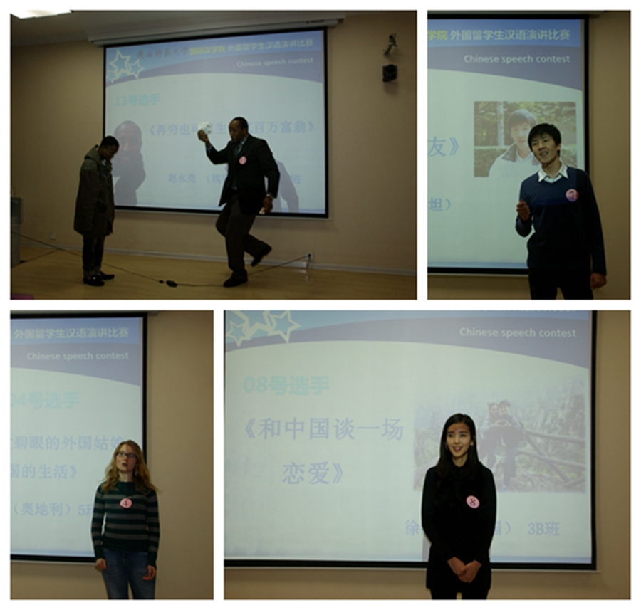 院长张建成发表了大赛致辞,鼓励大家积极表现自我,讲出心声,讲出精彩,展示自己留学经历中看到的“满园春色”,展示在“满目秋色”的季节里的学习收获,演讲出最好的自己。学生处副处长曲洪刚也鼓励说,演讲比赛是师大的传统特色,演讲比赛更能检验留学生的汉语水平以及对中国文化的理解,希望大家各展己能,取得好名次,以备在更高级别的赛事中为陕西师范大学增光添彩。