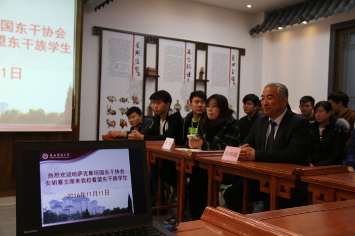 安胡塞主席对陕西师范大学多年来对东干学生的精心培养表示感谢,并对陕西师范大学的教学和管理水平给予了高度的肯定与赞赏。他说,从我校毕业的很多东干族学生在回国后,不仅已成为当地中资企业重要的智囊人才,同时给当地东干族带回了很多“新话”,给当地流传了近150年的“陕西话”注入了很多新鲜的语汇,增强了其时代感与生命力,可谓功德无量。此外,他提到,2017年是中哈建交25周年,同时也是陕西东干人来哈萨克斯坦国140年,希望届时可以在陕西师范大学召开东干文化国际研讨会,并设立专题,研究“一带一路”背景下东干学生高层次人才的培养问题。