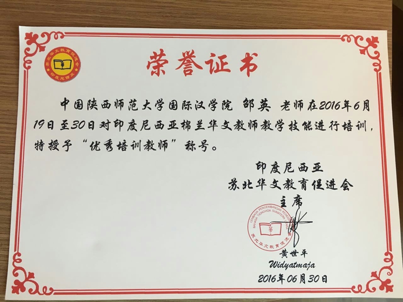 华文教育系罗爱瑾主任、讲师团三位教师及参加培训的老师共计60人参加了结业典礼。结业典礼上,黄世平主席亲自为每一位参加培训的老师颁发了结业证书。黄世平主席在结业致辞中说:“感谢中国国侨办对印度尼西亚华文教育事业的大力支持,感谢陕西师范大学讲师团三位教师不辞艰辛传授华文教学基础理论与中华文化知识,同时感谢各华校积极配合,珍惜难得的机会,让苏北地区的华文老师通过培训不断提高华文教学水平。正是在各方的大力支持与合作下,印度尼西亚的华文教育事业蒸蒸日上。”为表彰三位讲师在本次培训中的辛勤付出,印度尼西亚苏北华文教育促进会特为三位讲师颁发“优秀培训教师”称号。