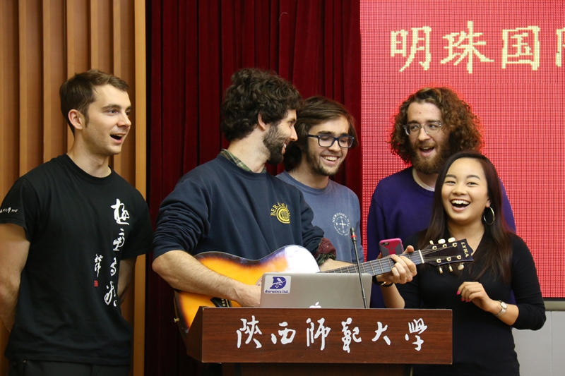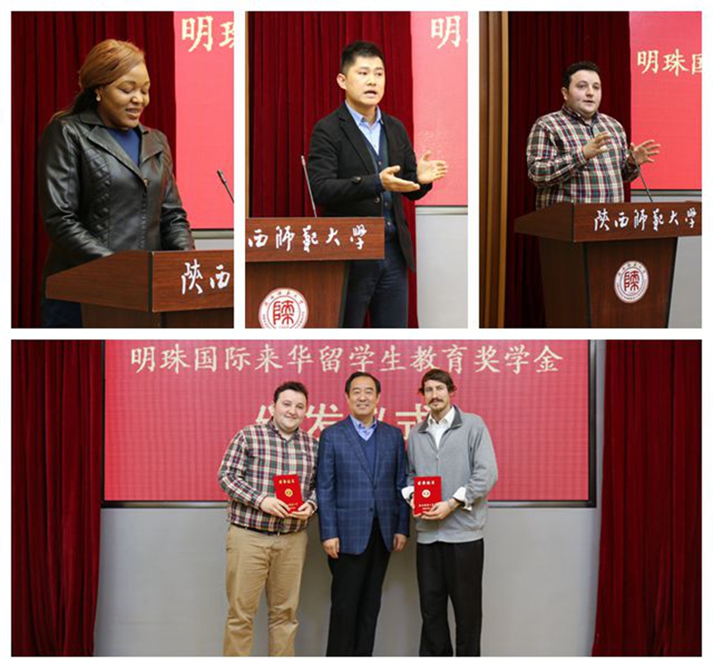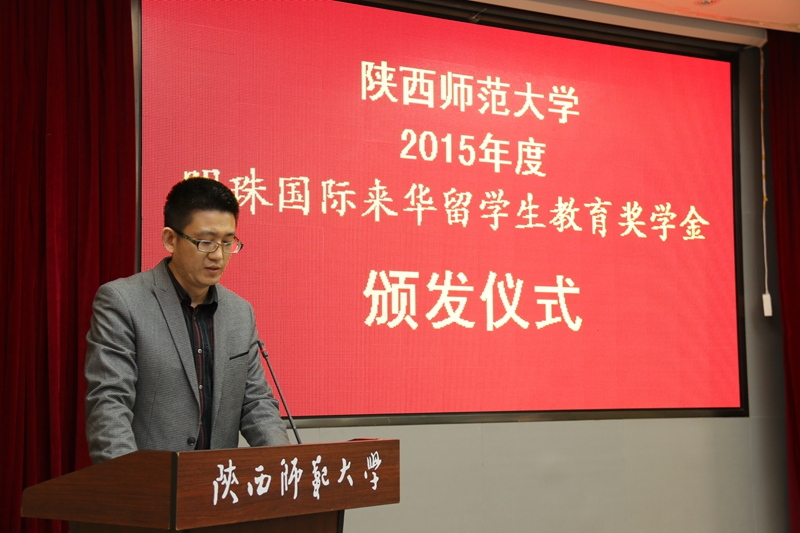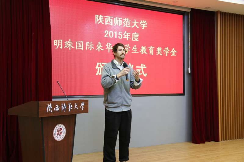 青年教师孙建伟分别作为获奖学生和教师代表发言。来自美国的留学生笨笨以及富布赖特项目留学生戴维和他的小伙伴们还分别表演了《诗经·木瓜》吟诵和《月亮代表我的心》歌曲合唱,用简短的学业汇报演出表达对学习汉语的热爱以及对明珠国际集团和陕西师范大学的感谢。