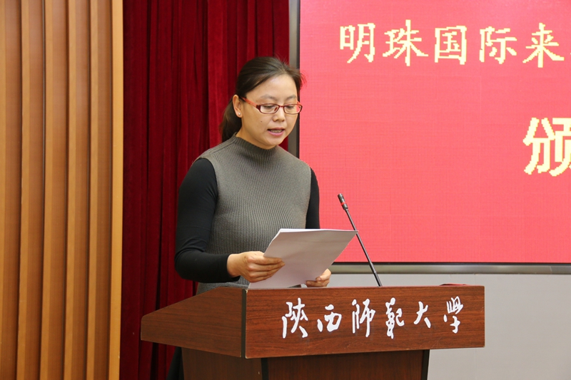 李萌代表明珠国际集团发表奖学金资助感言。她说,明珠国际集团自成立以来,一直秉承着热心奉献社会的雷电竞精神和关心教育事业社会责任担当,先后在陕西师范大学设立了“明珠国际留学生教育奖学金”和“自强之星—明珠国际奖”。两个奖项的设立,不仅体现了明珠国际集团与陕西师大之间深厚、不可替代的友谊,也为校企之间开展更深广的合作搭建了桥梁。俗话说,滴水之恩当涌泉相报。希望今天获奖的留学生能够好好珍惜把握在中国学习深造的机会,勤奋学习,积极进取,拓宽自身在汉语和其他学术领域的学习研究,用实际行动回馈社会,回馈企业对他们的资助和关爱。