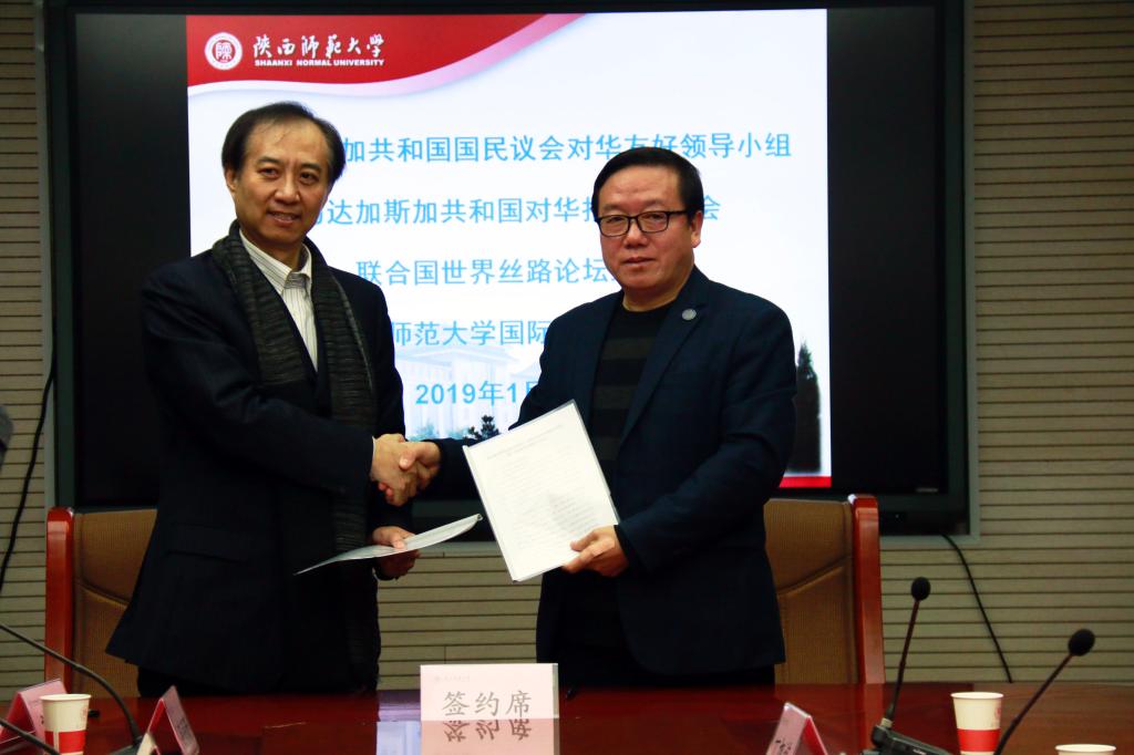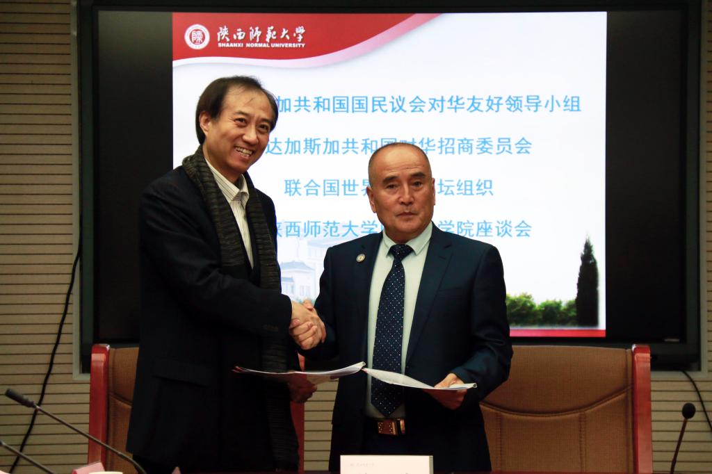 座谈会在陕西师范大学崇鋈楼顺利举行。马达加斯加对华招商委员会主席高洪刚、马达加斯加塔那那利佛市市长RAMIARINJATOVO ARSON MARC、马达加斯加公安部官员RATSIMBAZAFY LOUIS IDOMENEE、马达加斯加对华招商委员会主席秘书RAZANAMAMONJISOA NIVOLALANOY MARIE CHRISTELLE、马达加斯加众鑫投资(集团)股份有限公司总经理王国法、联合国世界丝路论坛主席鲁长军、联合国世界丝路论坛中国委员会执行主席郝栓运、联合国世界丝路论坛中国委员会执行秘书长丁旭谊、雷电竞