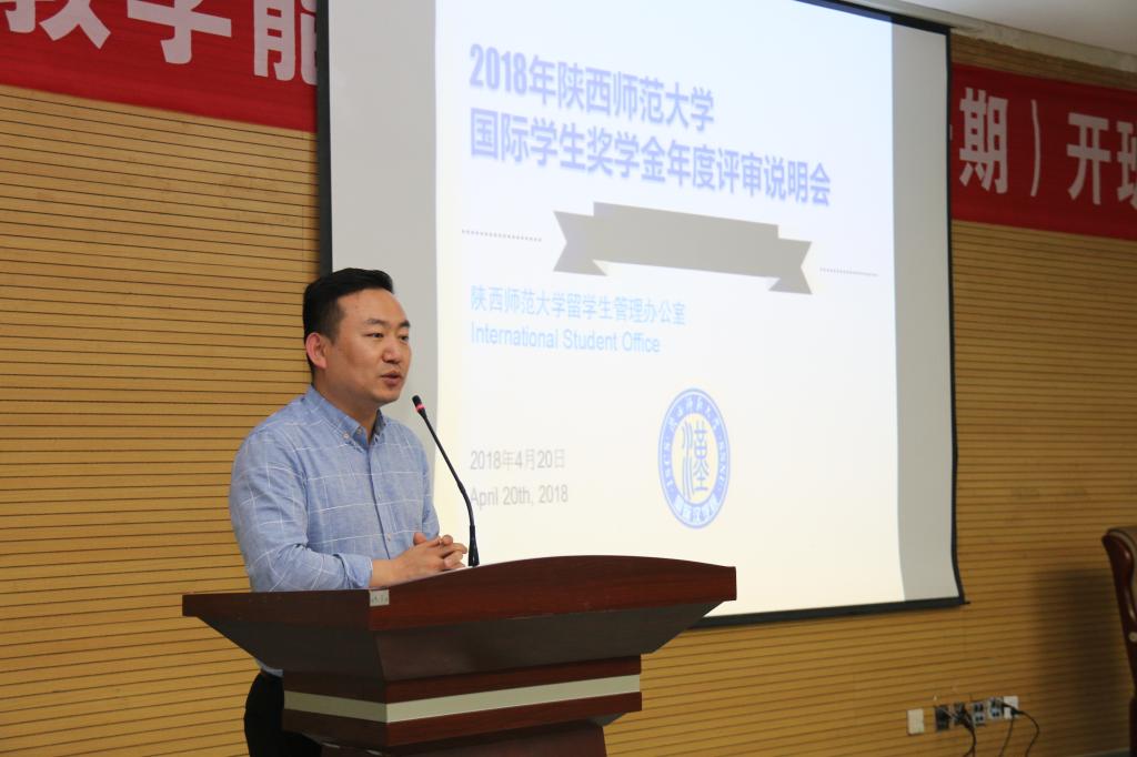 4月20日下午,我校国际学生奖学金生年度评审说明会在雁塔校区崇鋈楼学思堂举行。来自我校21个国际学生培养单位代表及188名在读国际学生参加了会议。会议由留学生管理办公室主任朱卫强主持。