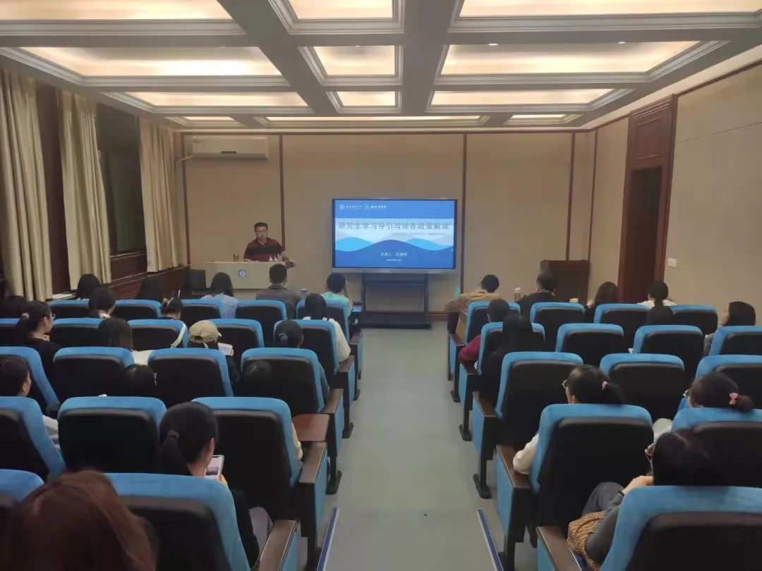 在研究生学习导引方面,石洛祥首先就“研究生读研期间应该做什么”提出了以下建议:广泛阅读,善于思考,勤于写作;关注时间管理,做好职业规划;扎实掌握专业知识,敢于勤于锻炼自我。接着,他提到研究生毕业前应该具备的能力,希望同学们培养科研创新能力和独立解决问题的能力,身心兼修,良友同行。最后,他围绕如何充实地度过研究生生活这一主题,就如何确定适合自己的研究领域、如何选择研究课题、如何阅读文献等方面给出了详细建议。在研究生培养政策方面,他重点对《陕西师范大学研究生学籍管理实施细则》和《陕西师范大学研究生学术论文学术不端检测和处理实施办法》两份重要文件进行了详细解读,叮嘱大家遵守规则、严谨治学。
