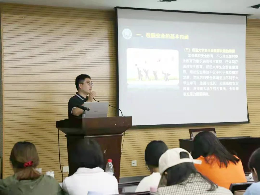 最后,张冲对做好高校安全工作的意义进行总结,他表示安全问题常谈常新,警钟长鸣,叮嘱同学们牢固树立安全意识,增强自我防范能力,共同建设“平安校园”。