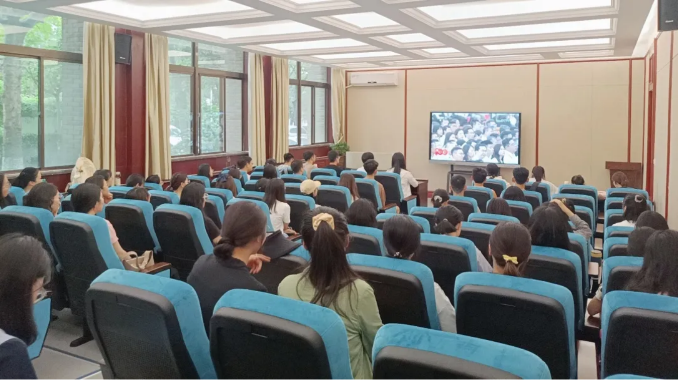 一楼报告厅,观看在天安门广场举行的庆祝中国共产党成立100周年庆祝大会的直播现场,虽然不在现场,但仍然在摄像机的记录中感受到了大家在建党100周年的兴奋激动之心。