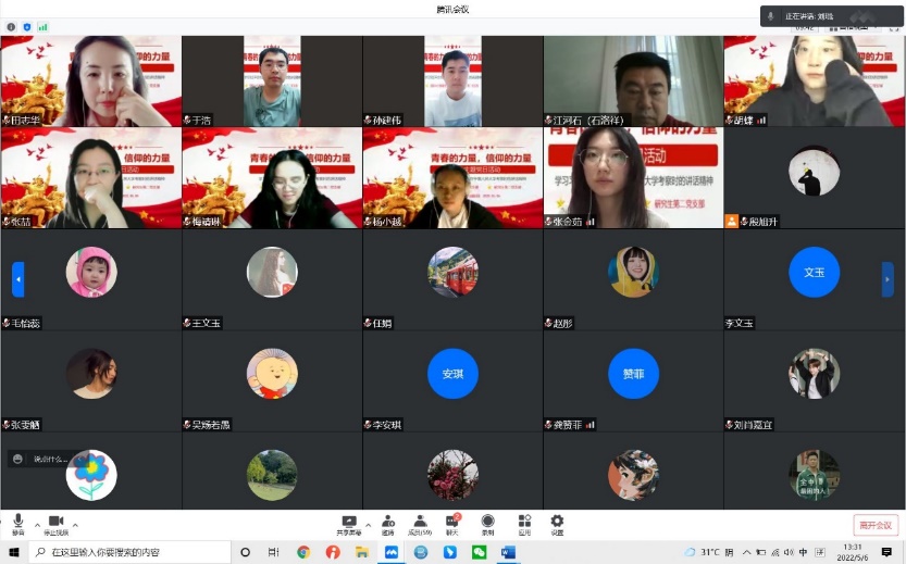 国际中文教师党支部、研究生第二党支部全体师生党员于5月6日中午13:30汇聚云端,联合举办了“青春的力量,信仰的力量”主题党日活动。