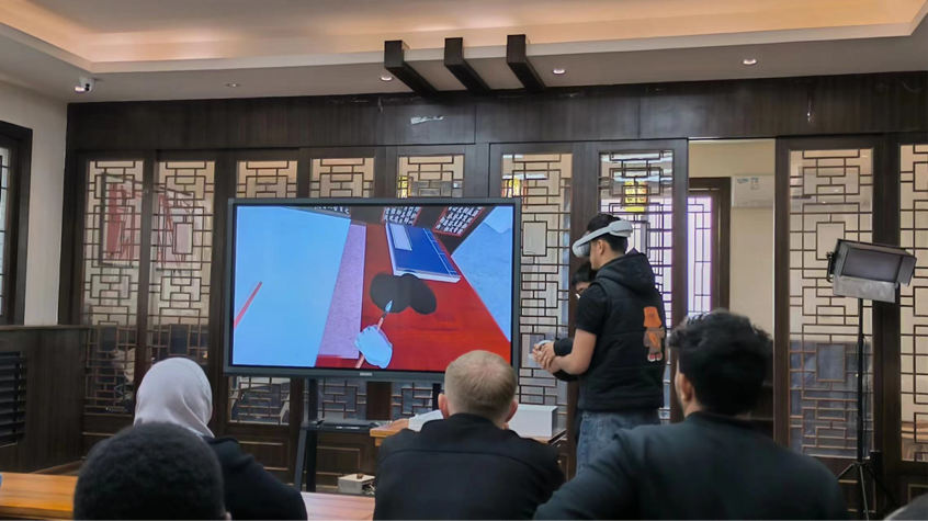在活动中,首先师生们共同体验了一场虚拟的书法艺术场馆展览,随后大家分享了自己的体会与感受,现场气氛非常活跃。最后孙增国教授细致讲解了汉字VR技术。他指出,书法艺术“元宇宙”沉浸式体验空间将中华传统文化与数字化技术进行了有机融合,是利用新形式、新手段弘扬传统文化,讲好中国故事的重要转化成果,也是新质生产力在国际中文教学和文化体验工作方面的重要表现。